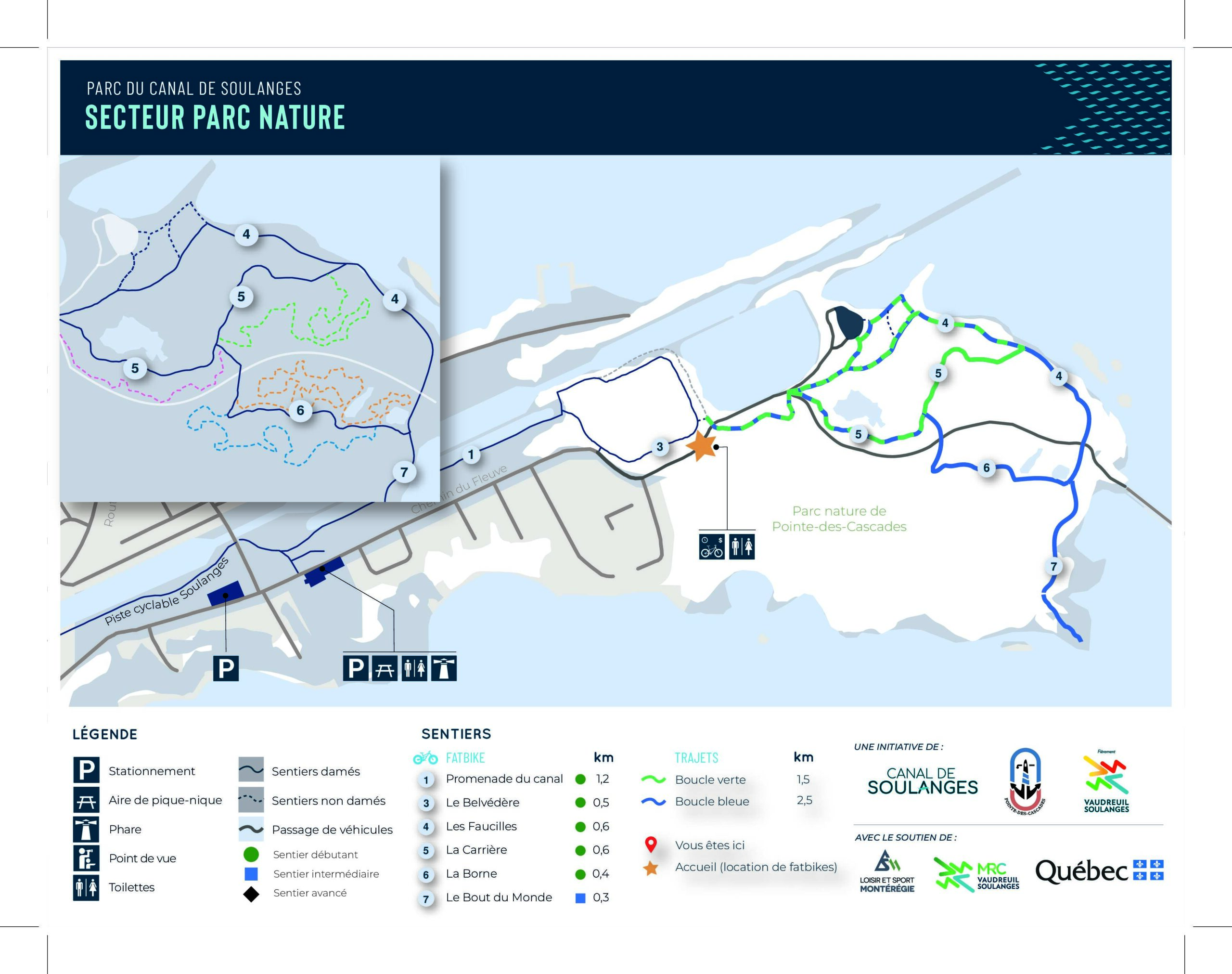 Stationnement: le stationnement est gratuit au début des sentiers, soit devant le parc Saint-Pierre. Débutez votre aventure à la Promenade du canal (juste à côté de la base de plongée) qui vous connectera au reste des sentiers.